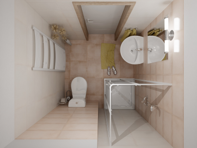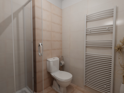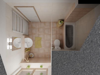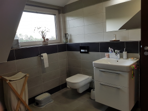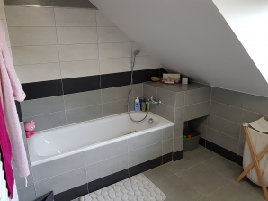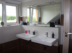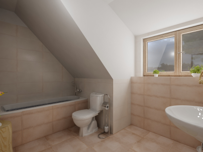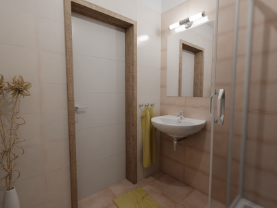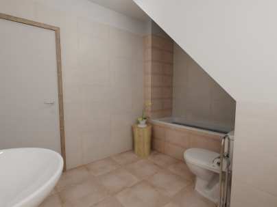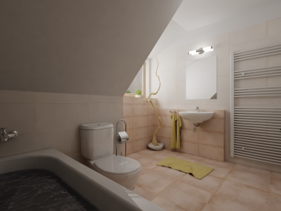 - laminátová podlaha nebo koberec v obytných místnostech a na chodbě v podkroví, v ostatních místnostech dlažba
